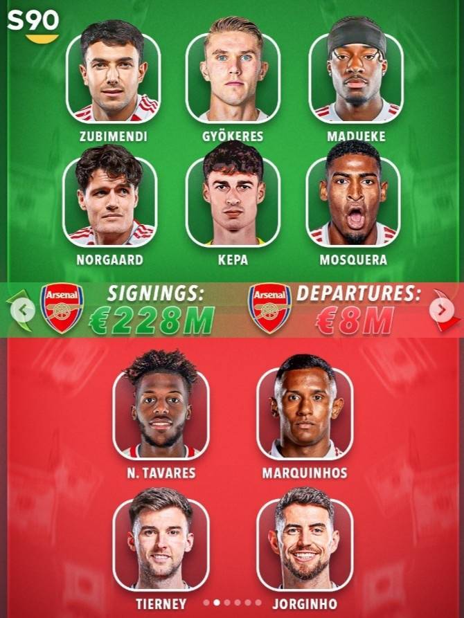 引援(2.28亿欧):祖比门迪、约克雷斯、马杜埃凯、诺尔高、凯帕、莫斯克拉