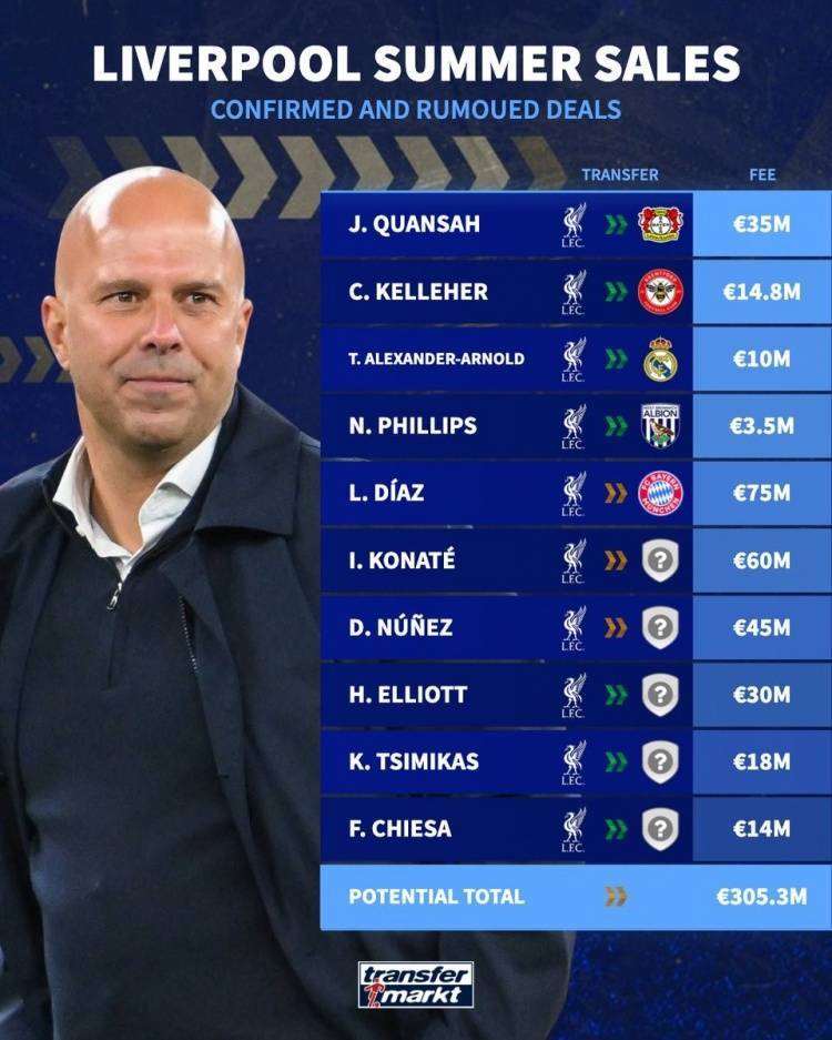 直播吧7月29日讯 利物浦边锋路易斯-迪亚斯转会拜仁即将敲定,《转会市场》也根据近期动向预测了利物浦今夏可能将出售10人并套现3亿欧。